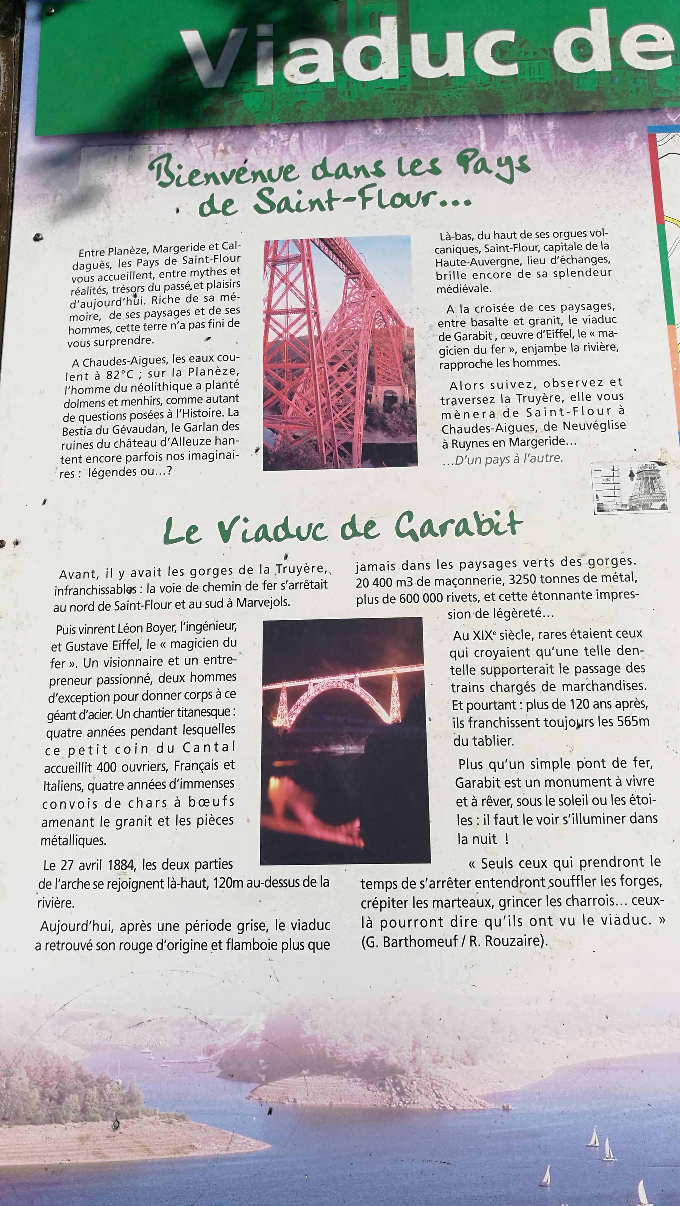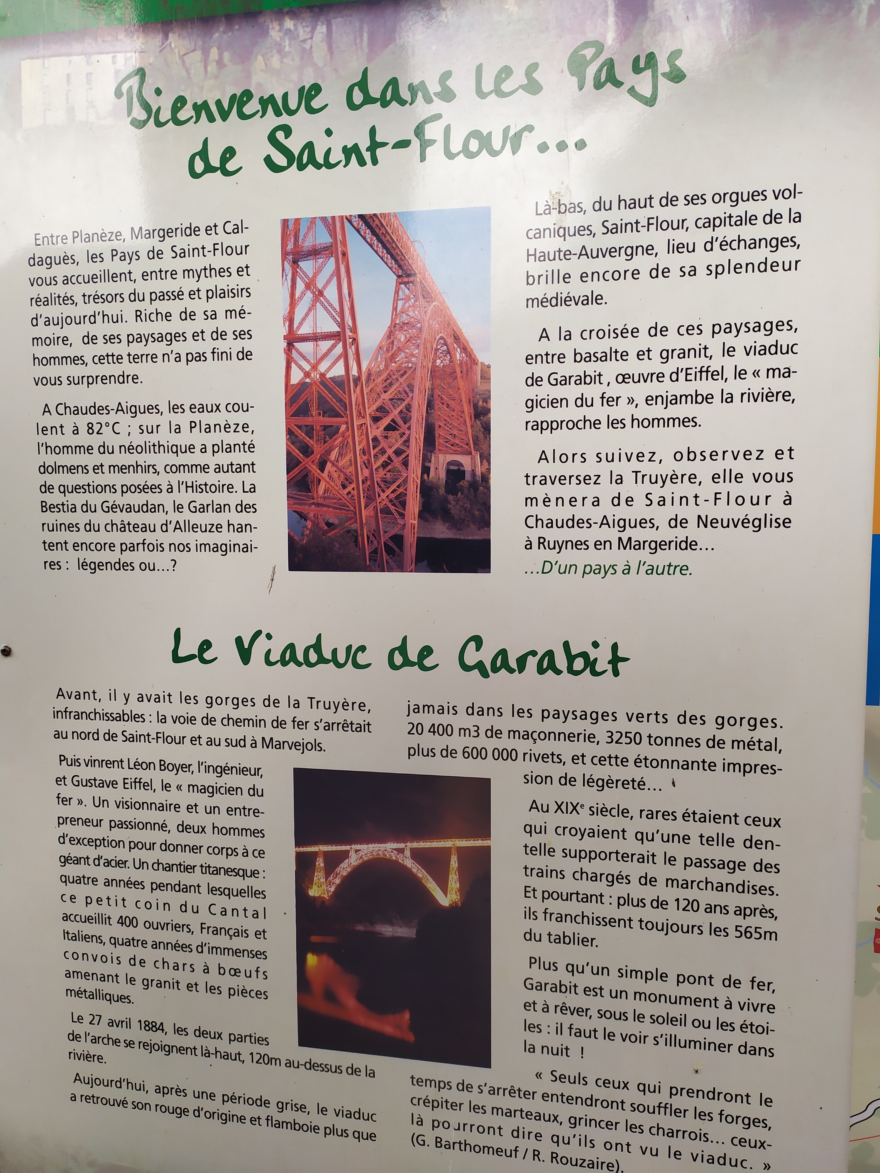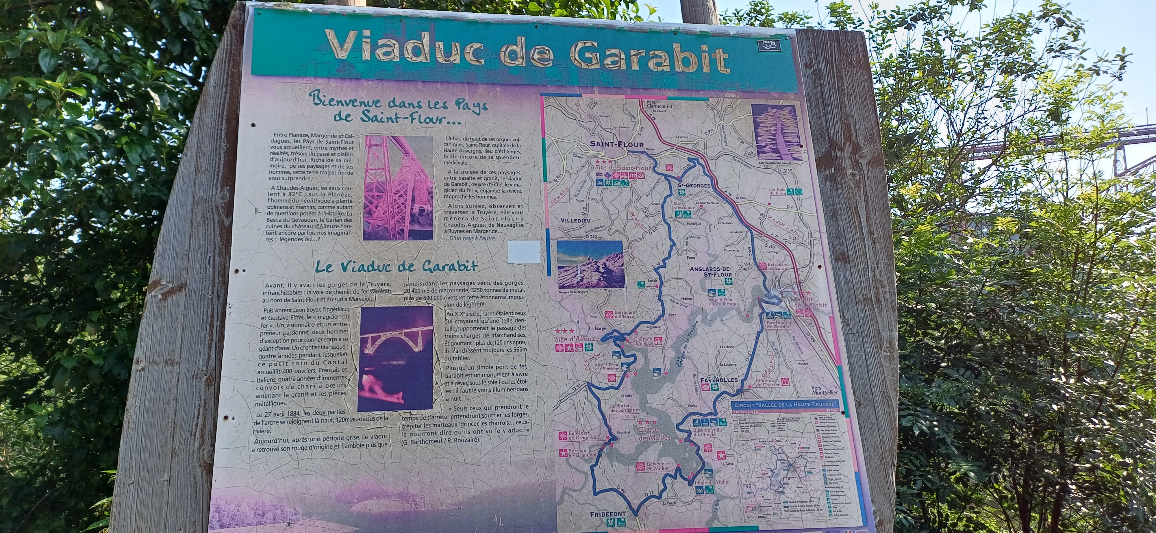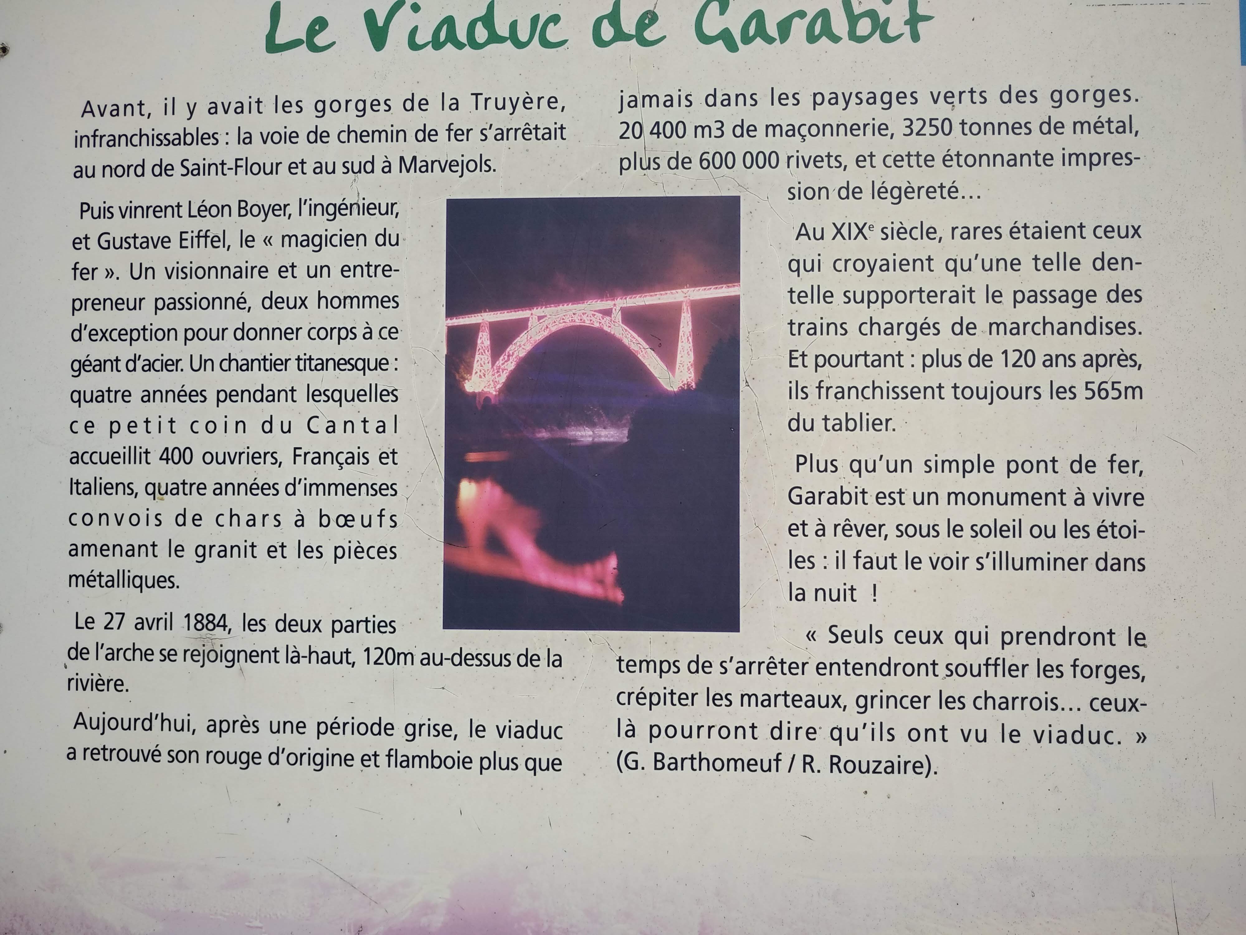 Séjour agréable dans le Cantal première visite de Saint Flour au Pont du Garabit qui enjambe la rivière de la Truyére construit en 1880-1884 par Gustave Eiffel ingénieur mise en service en 1888 pont en arc long de 565 m. Haut de 165 m. Matériau fer riveté à voir